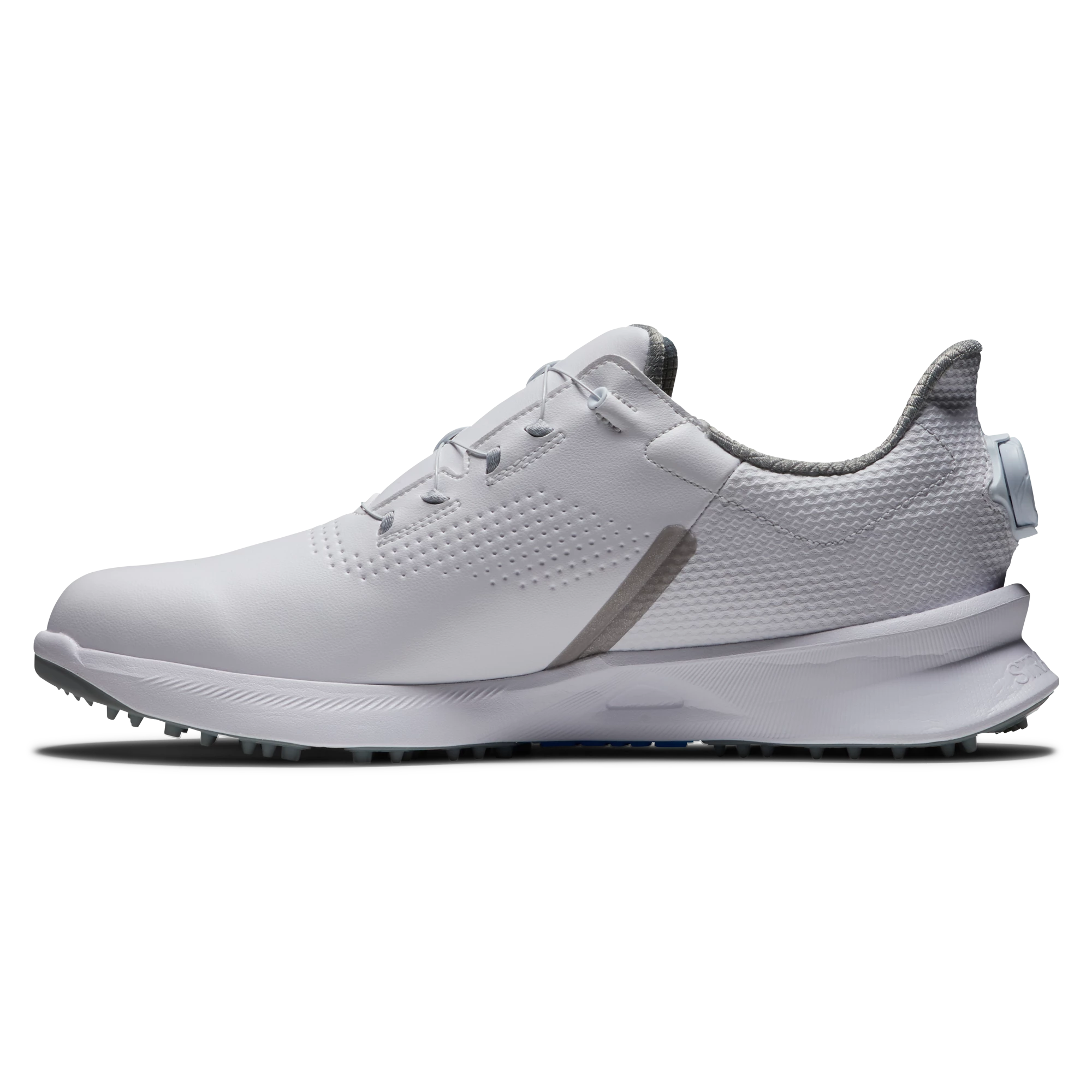The shoe targets modern golfers seeking a sharp, athletic silhouette, by combining streamlined, waterproof, synthetic uppers with sculptured design elements, including a mid-foot bevel and an exaggerated platform.